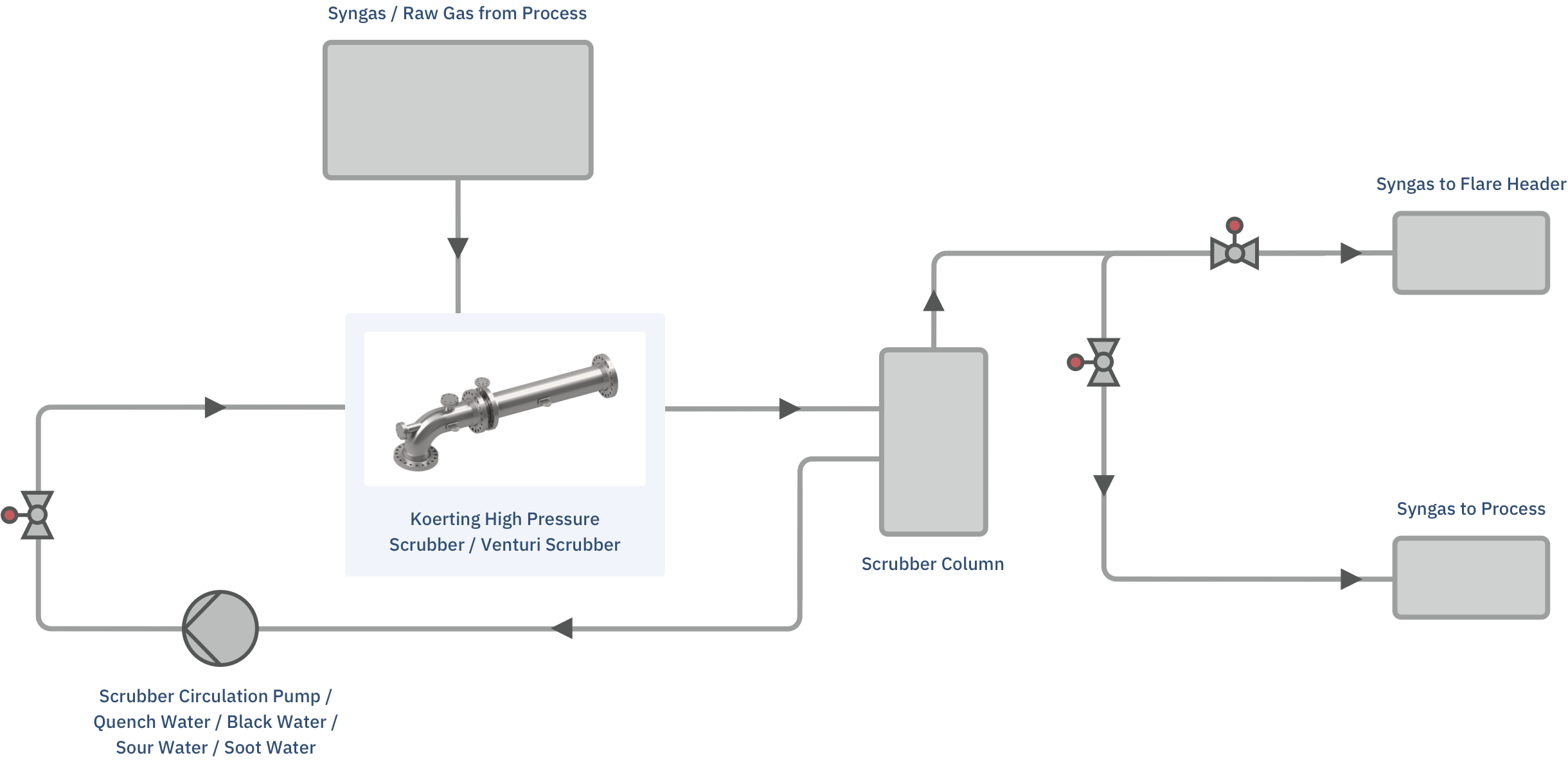 Syngas production, i.e. the industrial production of gas mixtures and H2, are just two examples of the wide range of potential applications. The composition of the primary gases varies depending on the application, but mostly consists of H2, CO, CO2, N2, and H2O which virtually always contain a certain amount of process-related soot. Water is used as the scrubbing medium. High-pressure, Körting Venturi scrubbers are used in numerous processes.