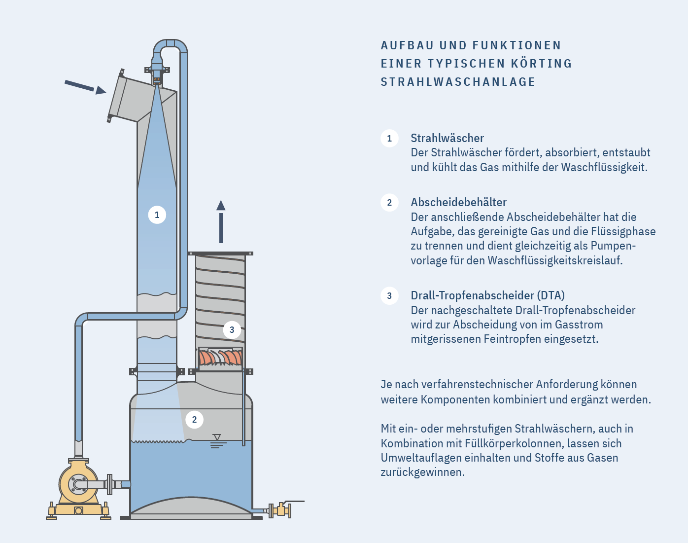 - die Kombination von Gasförderung (Druckgewinn) mit Entstaubung, Absorption und Kühlung