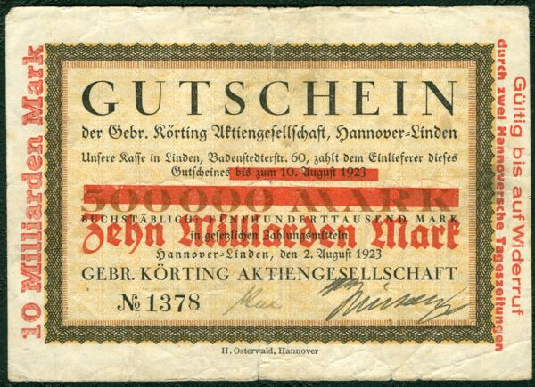 In ihren Anfangsjahren wütet die Hyperinflation in der jungen Weimarer Republik und erreicht im September 1923 ihren Höhepunkt. Die Preise für ein Brot erreicht den Milliardenbereich und Geldscheine werden nicht mehr gezählt, sondern gewogen. Um die Mitarbeiter in diesen Wirren dennoch bezahlen zu können, druckt Körting zwangsläufig eigenes Notgeld.